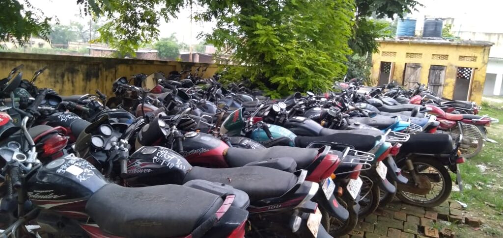 घोसी कोतवाली में धूप व वर्षा की वजह सड़ रही है सैकड़ों तादात में दो पहिया व चार पहिया वाहन