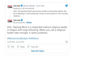 उन्हें जमानत शुक्रवार, 8 जुलाई को मिली। एक जून को कट्टर हिंदुत्ववादी नेताओं को कथित तौर पर नफरत फैलाने वाला बताने पर मोहम्मद जुबैर के खिलाफ सीतापुर के खैराबाद थाने में एफआईआर दर्ज की गई थी। एफआईआर उनके द्वारा किए गए उस ट्वीट के बाद दर्ज की गई है, जिसमें उन्होंने यति नरसिंहानंद, महंत बजरंग मुनि और आनंद स्वरूप को ‘घृणा फैलाने वाला’ [hatemongers] कहा था। वहीं एएसजी द्वारा दिए गए तर्कों में से एक यह था कि बजरंग मुनि सीतापुर में एक ‘सम्मानित’ धार्मिक नेता हैं, जिनके बहुत से अनुयायी है।